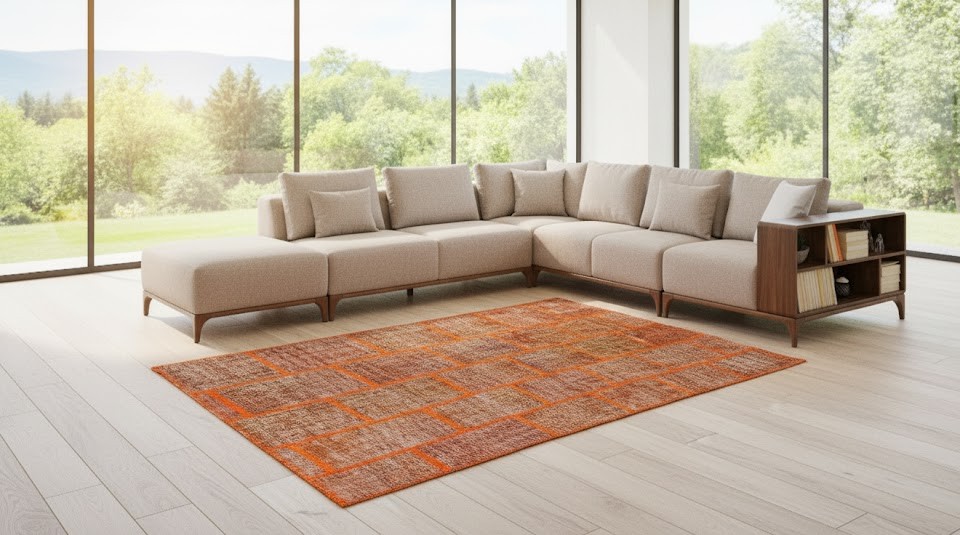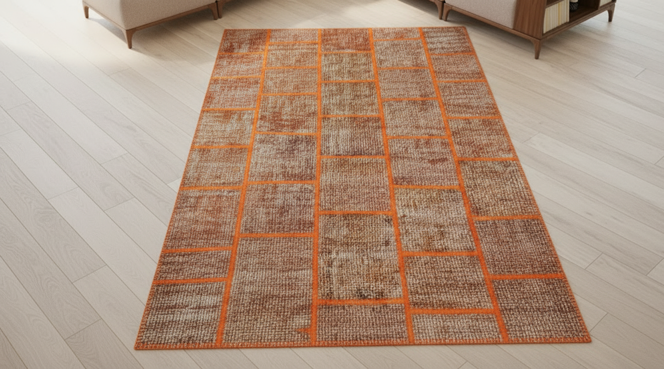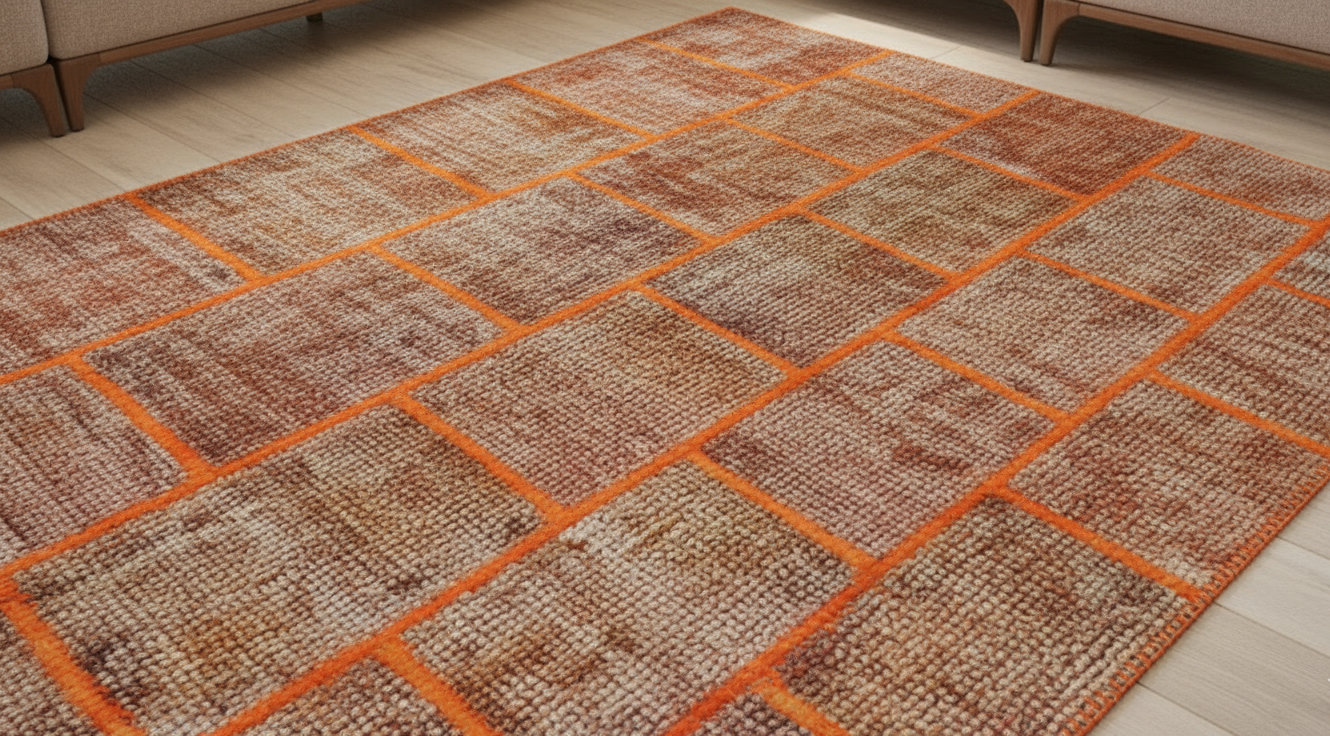 Amber Grid Patchwork Rug – Handmade Wool Carpet in Red & Orange
