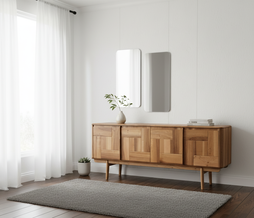 Brick Console Table (With Mirror Set) is constructed using first-quality solid hardwood to guarantee years of durability and a robust structure. Its clean, modern aesthetic with subtle rustic charm lets it integrate effortlessly into contemporary, mid-century, or transitional decor styles.