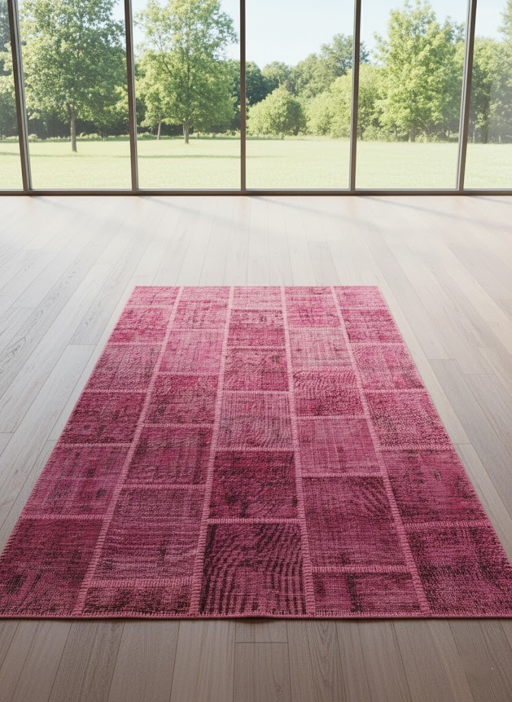 The patchwork layout features varied fuchsia-toned squares, layered textures and subtle vintage braiding — producing a luxurious accent carpet with visual depth and personality. Designed for homeowners who appreciate bold design and high-quality materials.