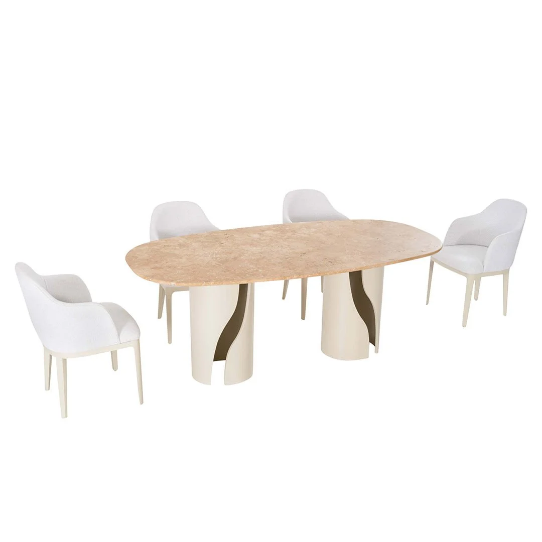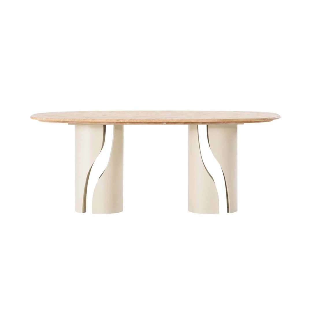 The tabletop features natural travertine marble, offering both artistic appeal and exceptional durability.