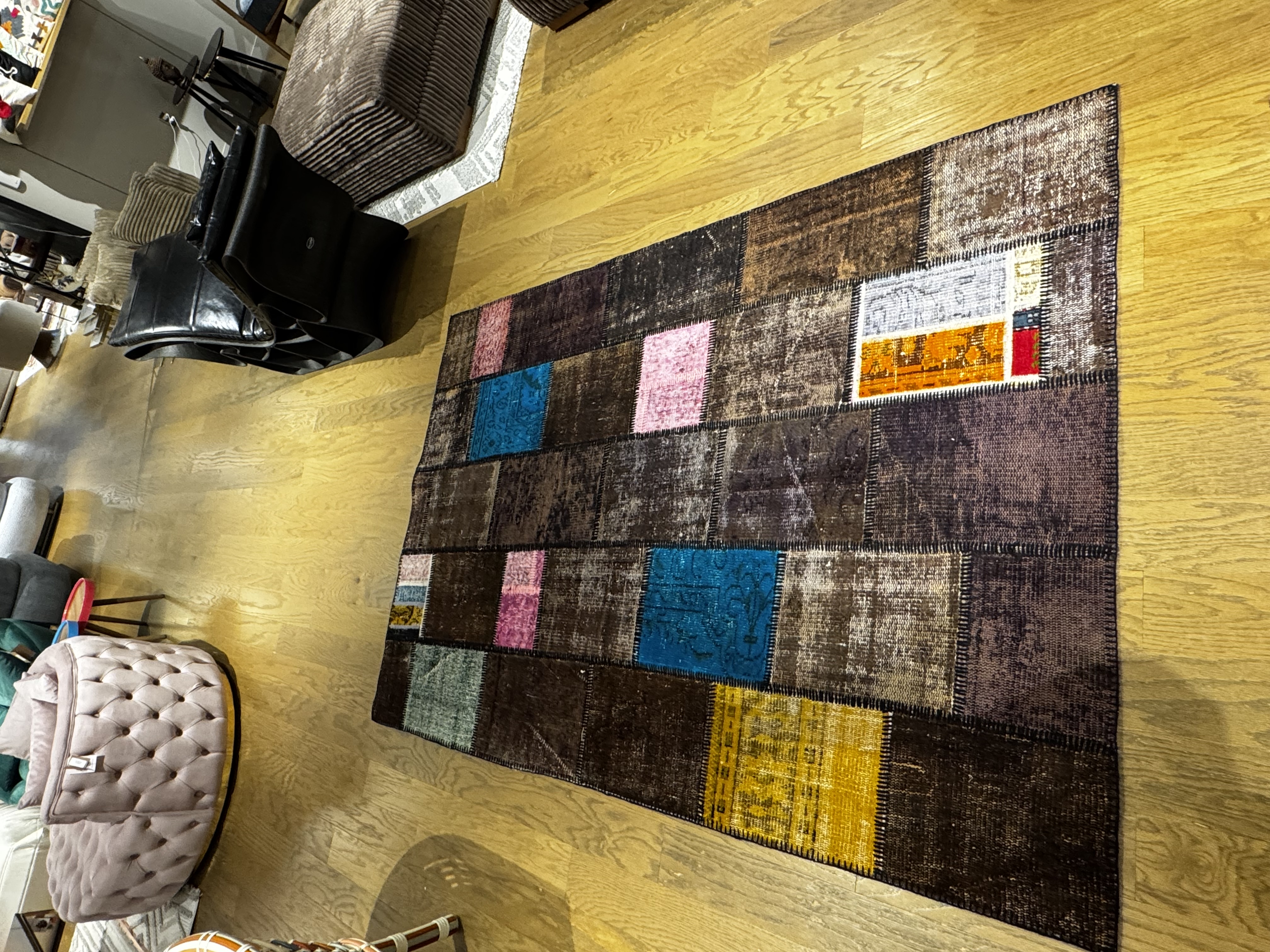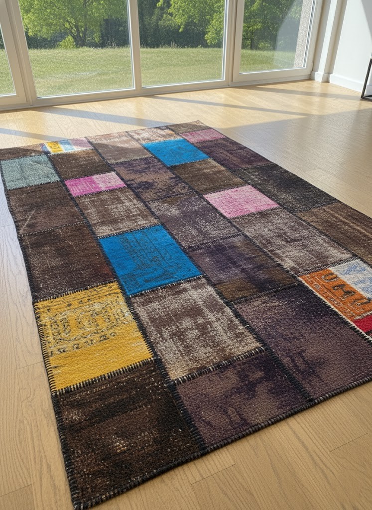 Earthline Patchwork Rug – Dark Brown with Color Highlights