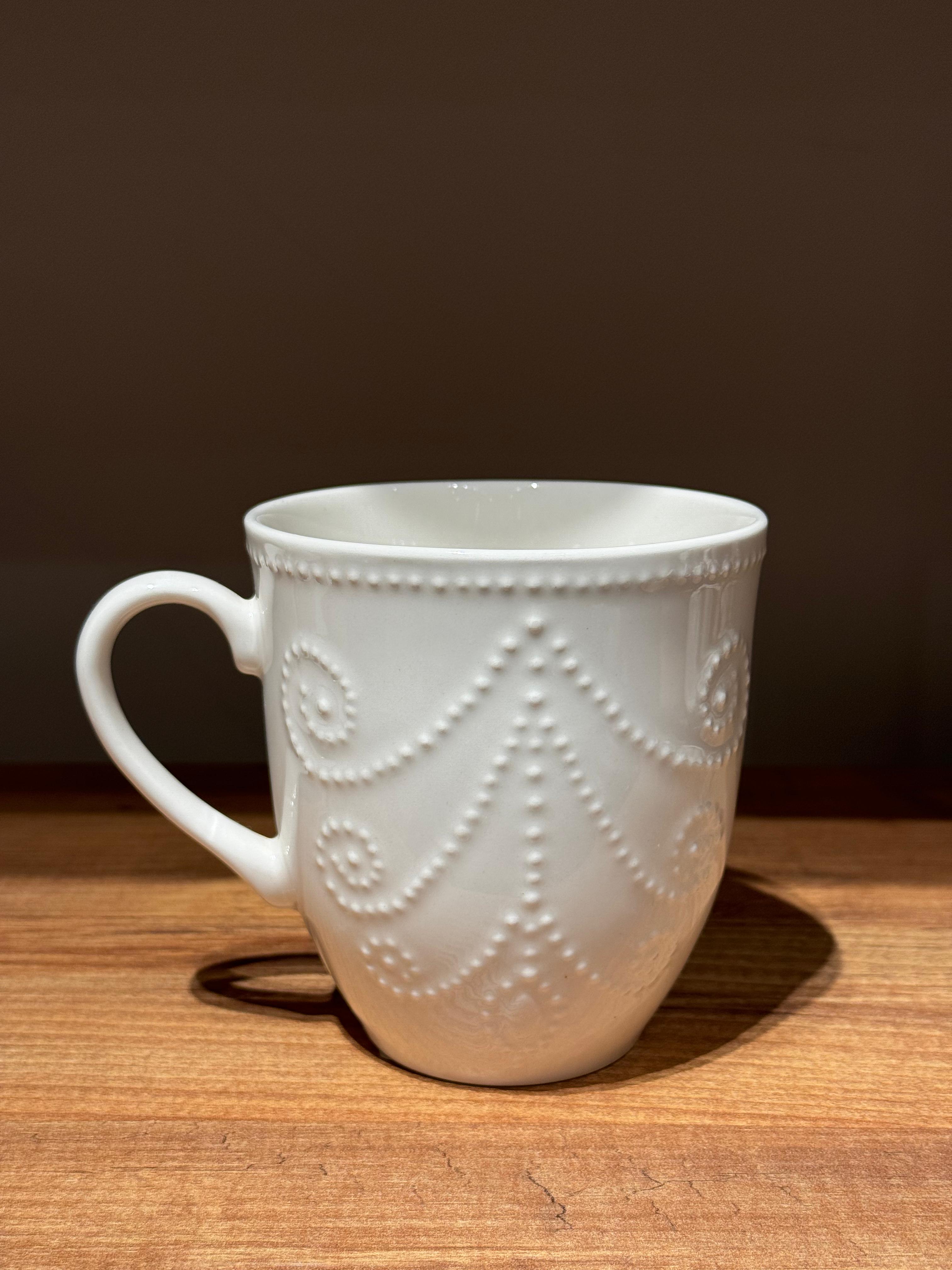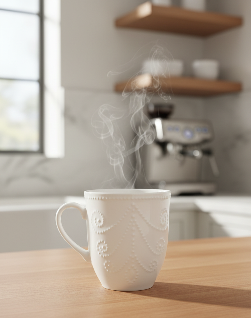 The embossed floral and dotted “Buket” design adds a refined texture that blends beautifully with modern and classic kitchen styles alike. Its pure white finish and comfortable handle make it perfect for your daily coffee or tea ritual — whether at home or in the office.