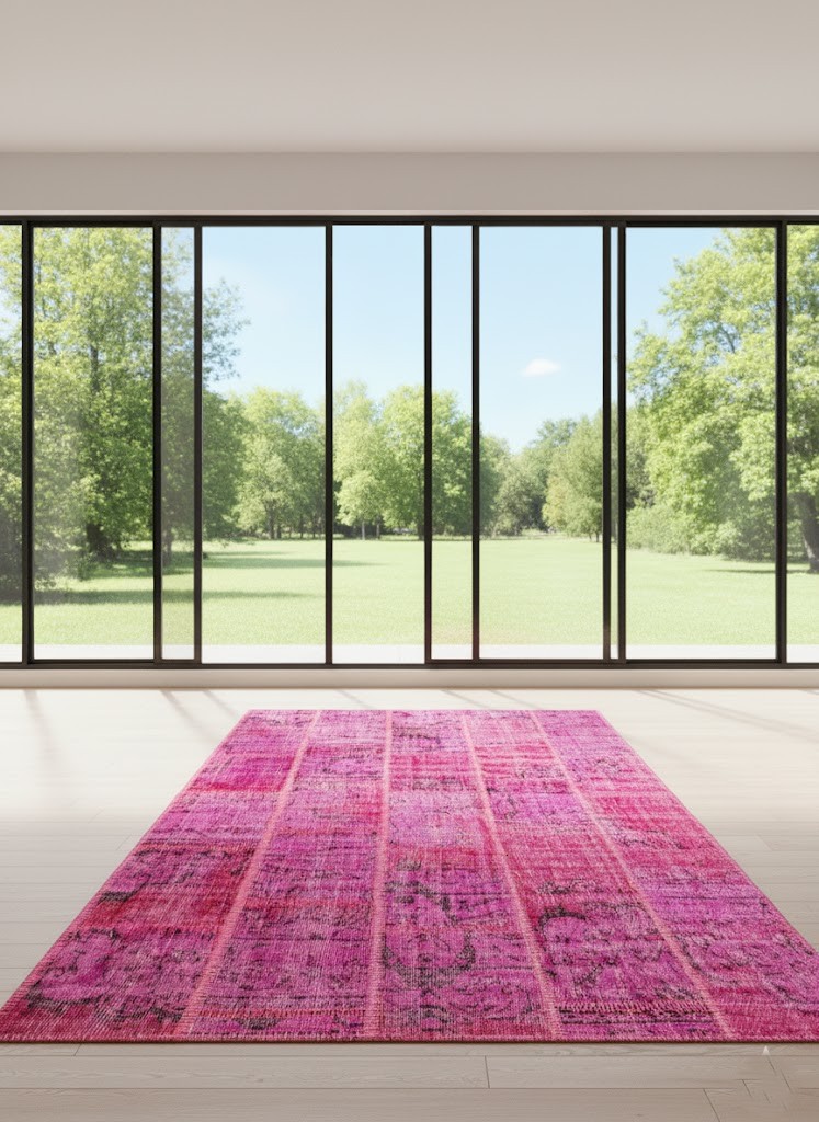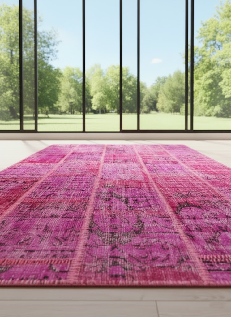 The Fuchsia Bloom Rug features deep pink and magenta tones, delicately contrasted by subtle vintage patterns. Its rich color palette adds a bold, energetic accent to any space, making it both a statement piece and a versatile décor element for modern or bohemian interiors.