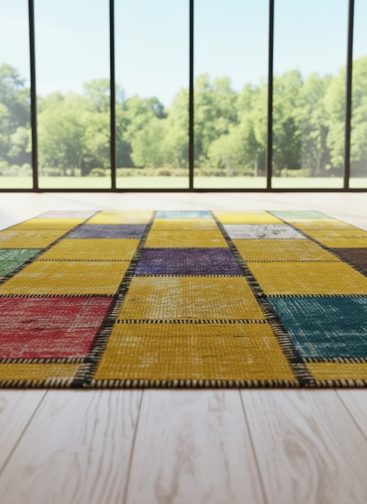 Perfect for living rooms, studios, or creative spaces, the Golden Mosaic Rug pairs beautifully with neutral furniture and wooden floors. Its bright yellow palette instantly lifts the mood of any space, creating a cozy yet energetic atmosphere.