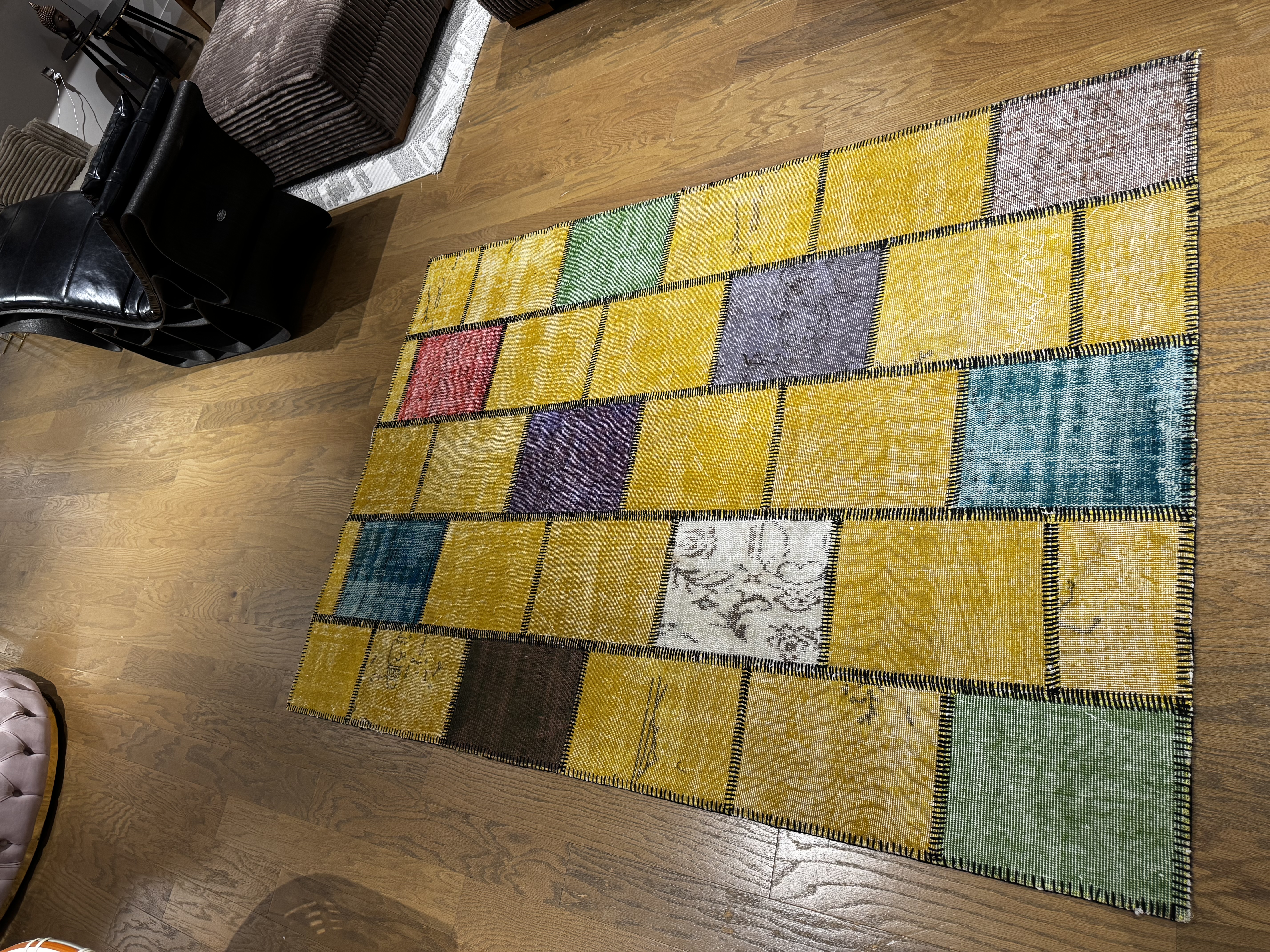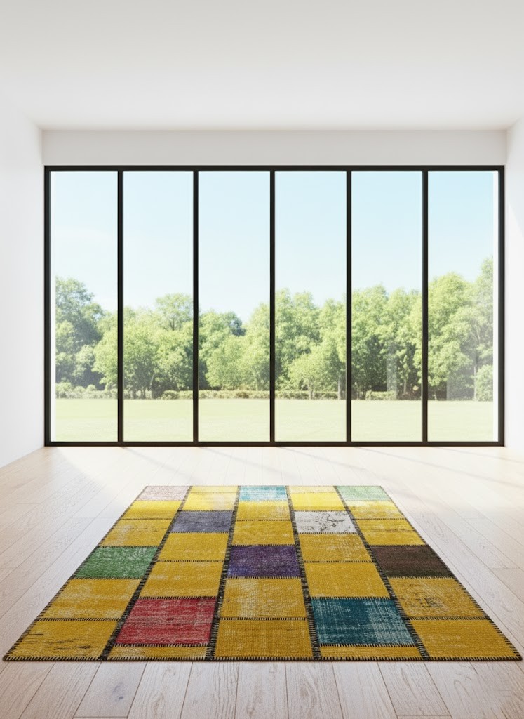 Illuminate your home with the warmth and elegance of the Golden Mosaic Rug. Crafted from 100% natural sheep wool, this handmade patchwork carpet captures the perfect balance of color, texture, and artistry. Its radiant yellow tones paired with mosaic-inspired patterns create a stunning visual centerpiece for any interior.