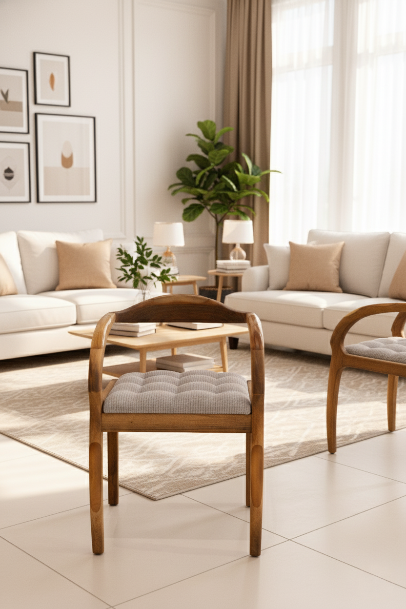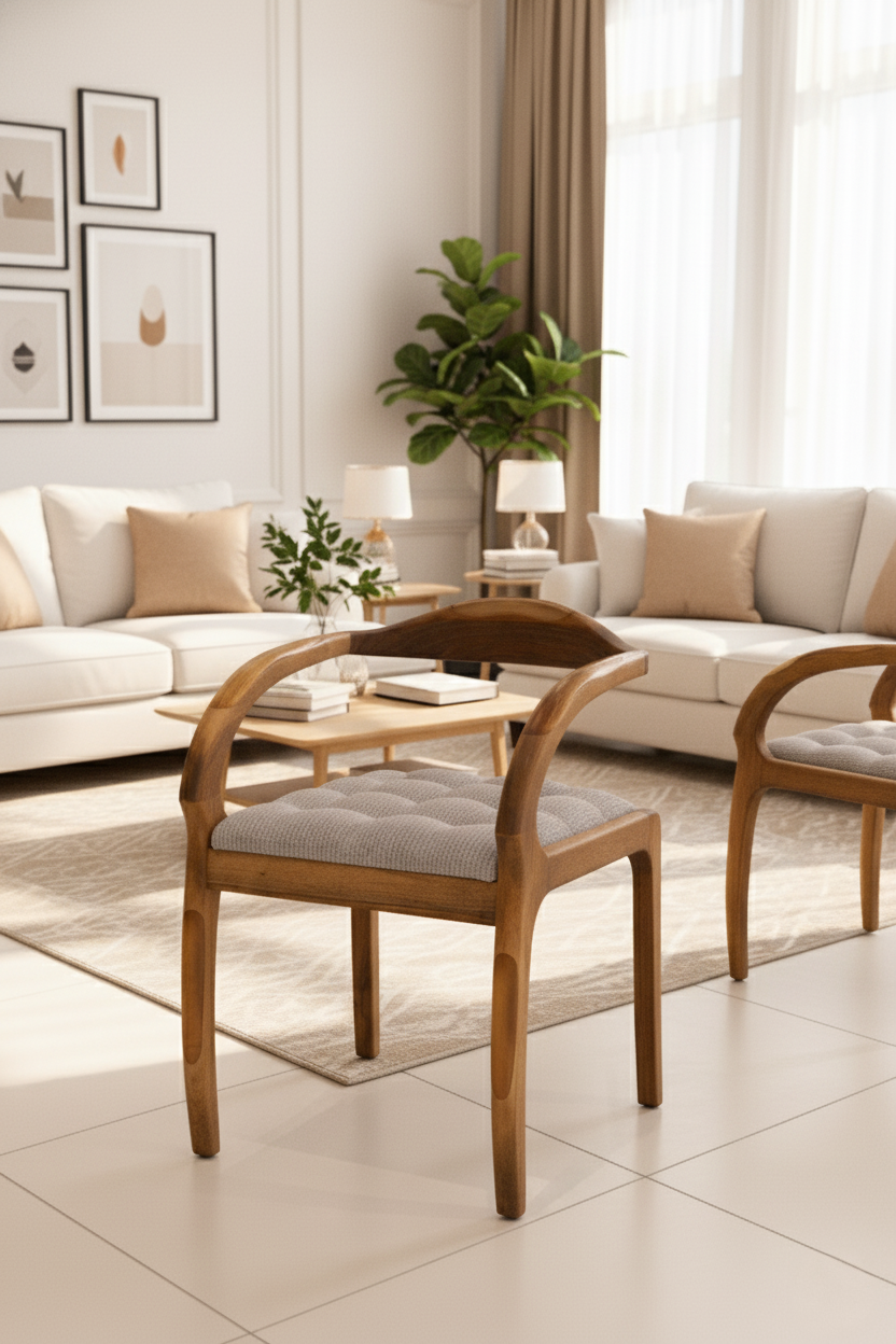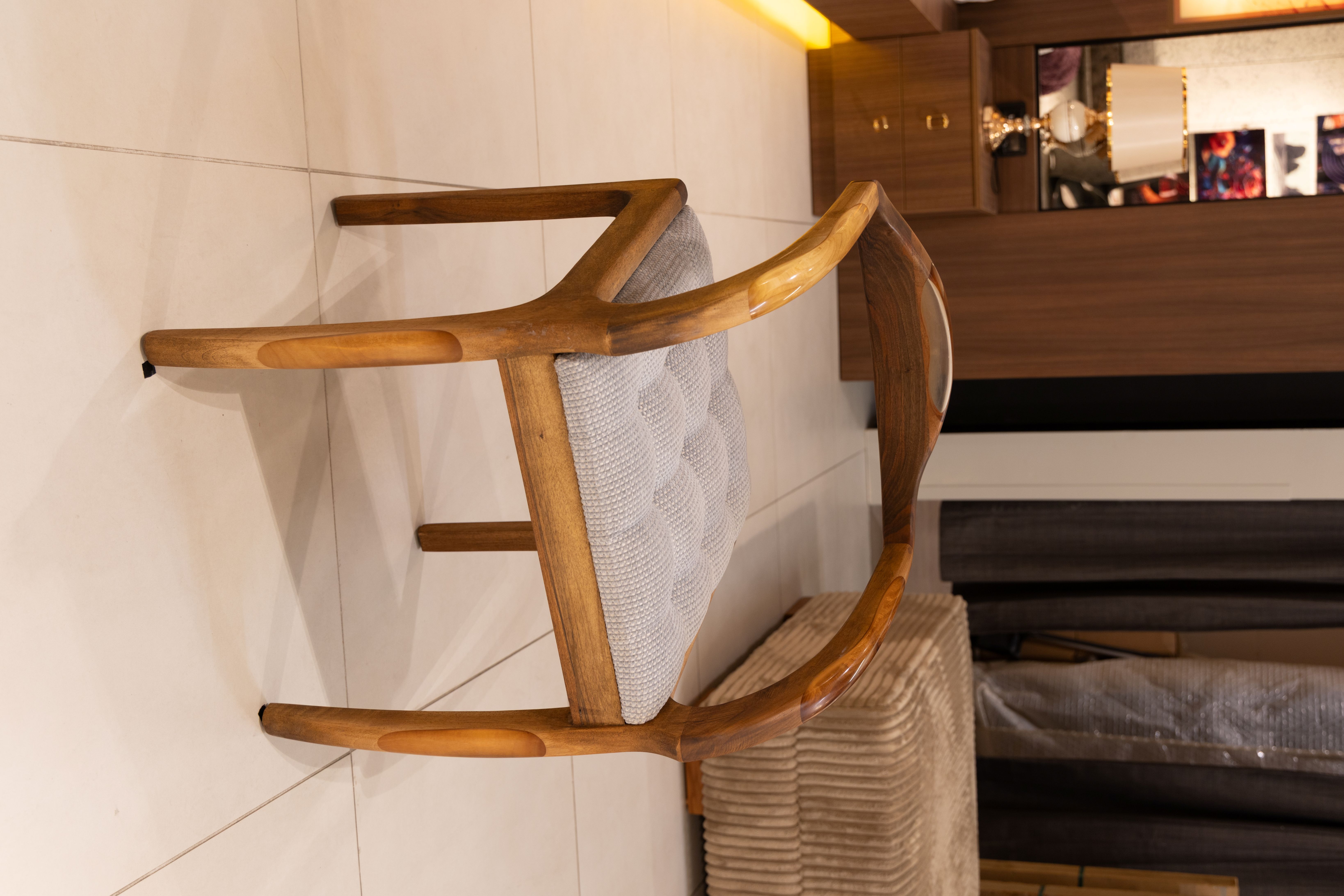 The frame is crafted from high-quality walnut hardwood, chosen for its strength, rich grain, and long-lasting performance. The epoxy-finished arm and back structure enhance the chair’s modern silhouette while reinforcing its durability. The seat is upholstered in premium Turkish cotton fabric, offering a soft, breathable feel that is highly resistant to wear and easy to clean—perfect for everyday use.