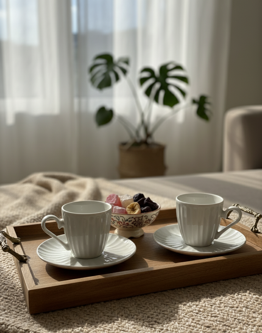 Each cup stands out with refined detailing on a pure white porcelain base. These sophisticated touches bring a sense of elegance and artistic charm, making it perfect for refined Turkish coffee or espresso presentations.