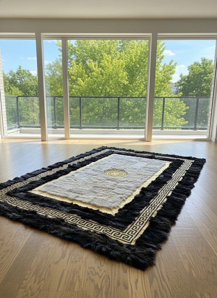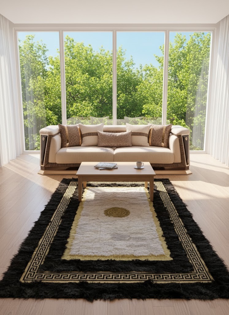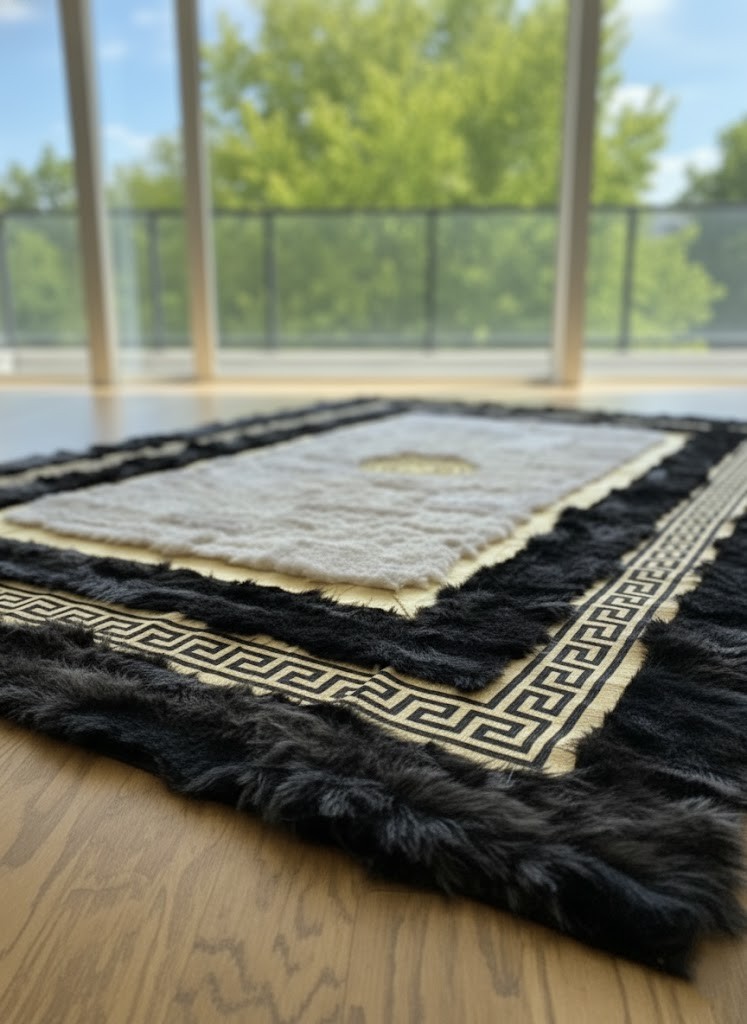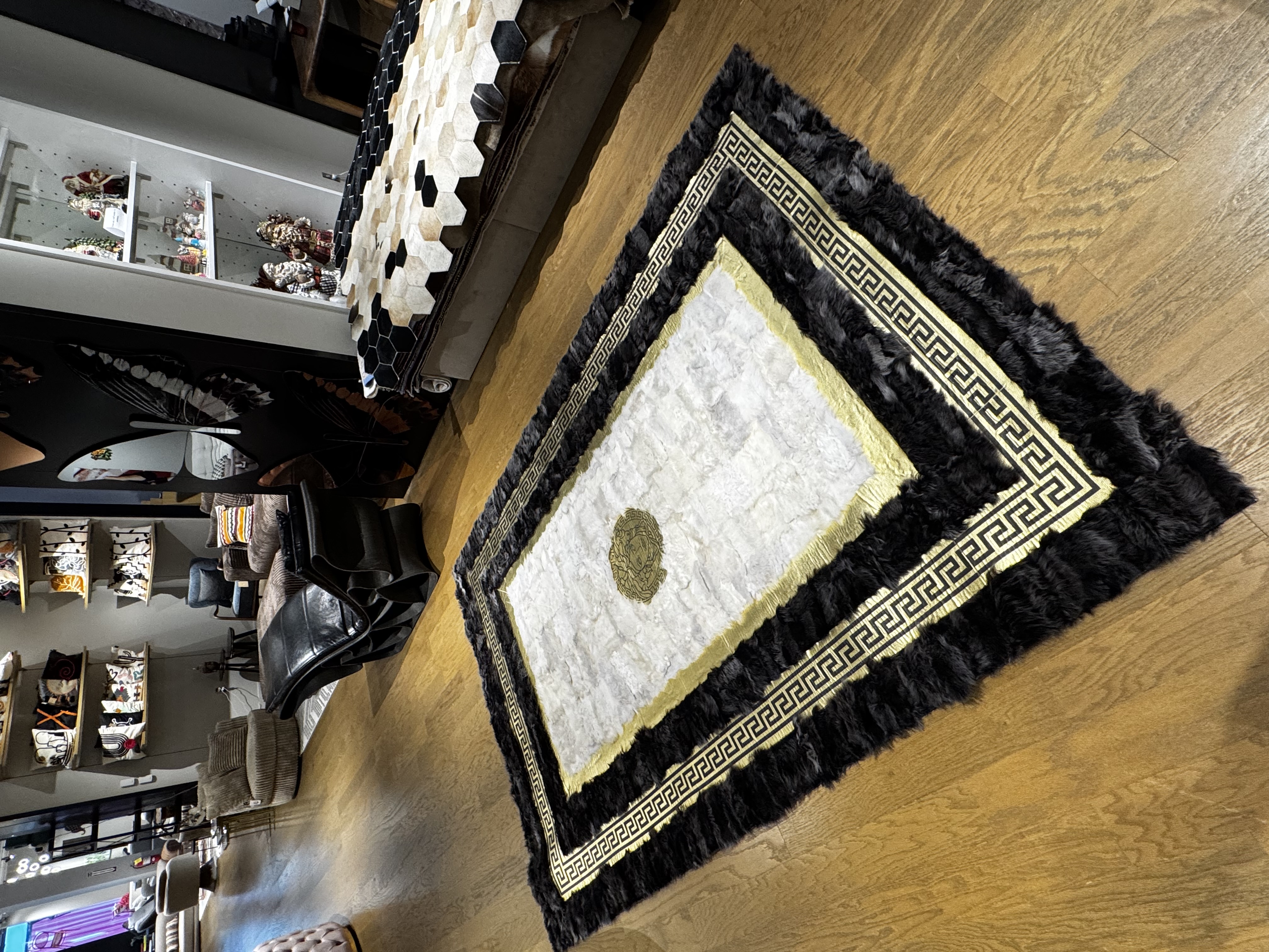 Luxury Black & Gold Greek Key Fur Area Rug. Crafted from