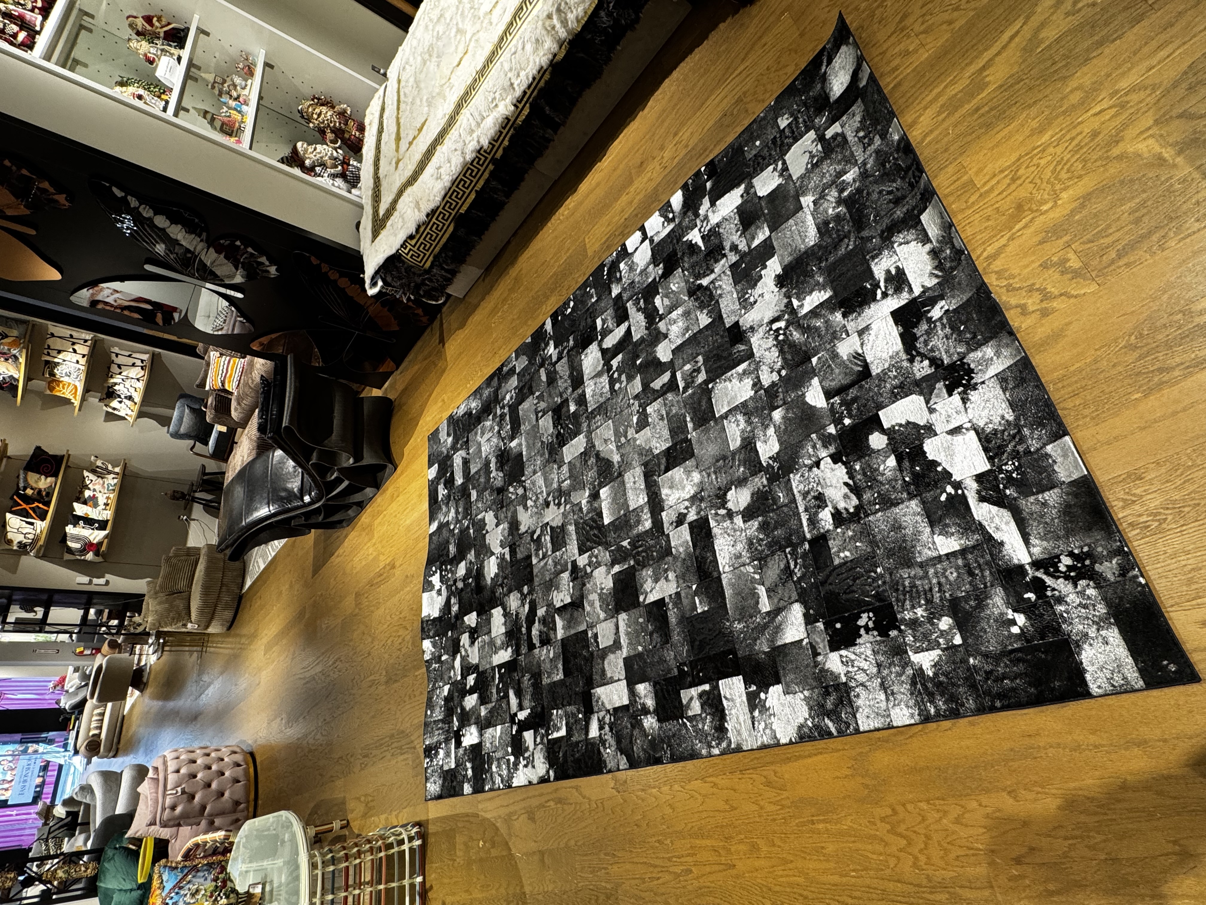 cowhide-inspired rug delivers a sophisticated, high-contrast design