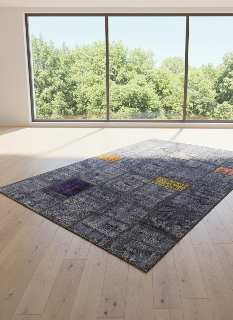 Midnight Mosaic Patchwork Rug – Handmade Blue Rug with Color Accents