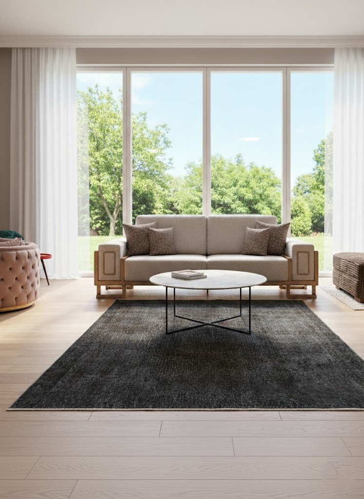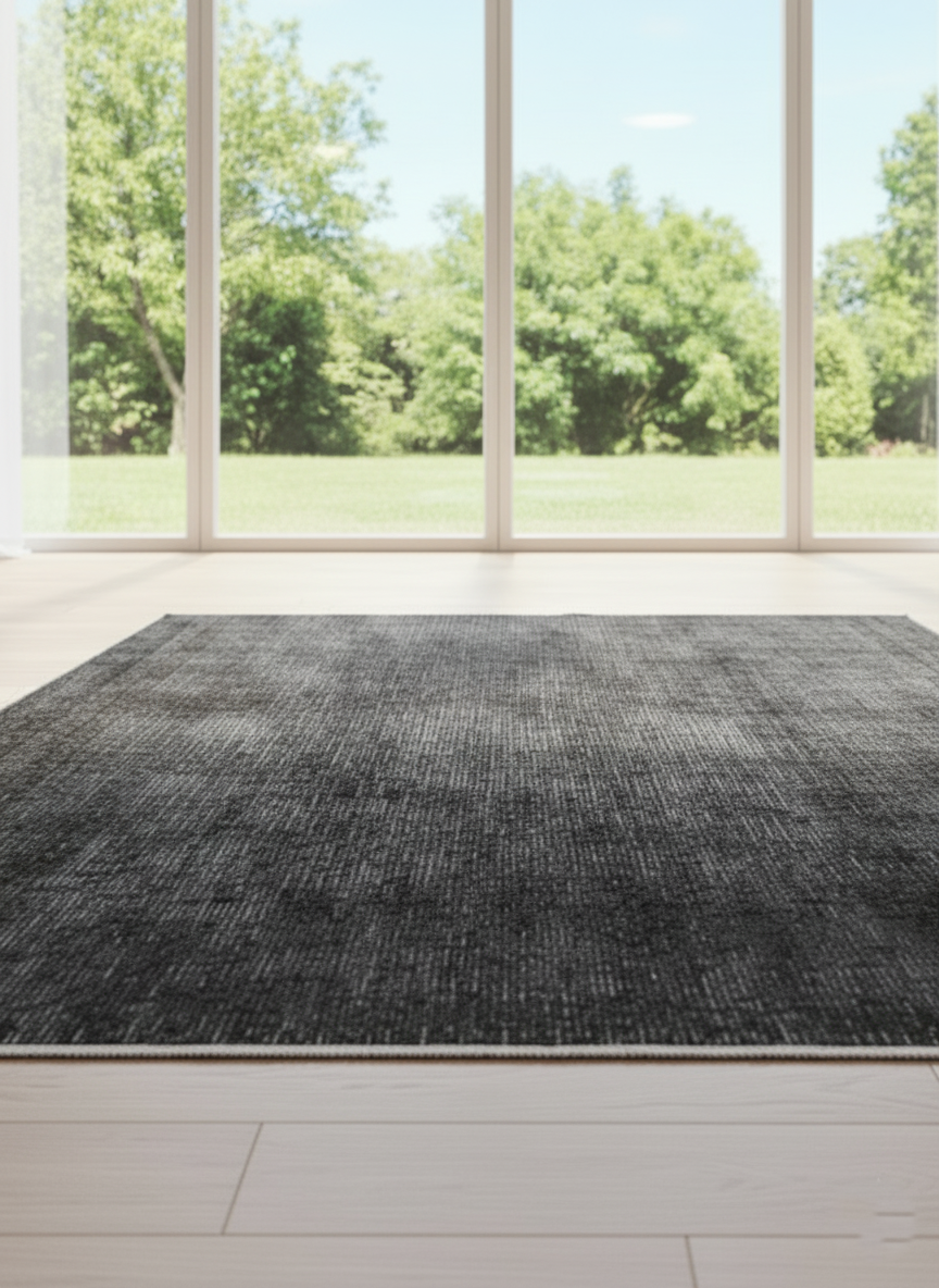 The Midnight Velvet Rug features a charcoal black palette that balances luxury and simplicity. Its minimalist design complements modern, Scandinavian, or industrial décor — creating a serene and polished atmosphere.
