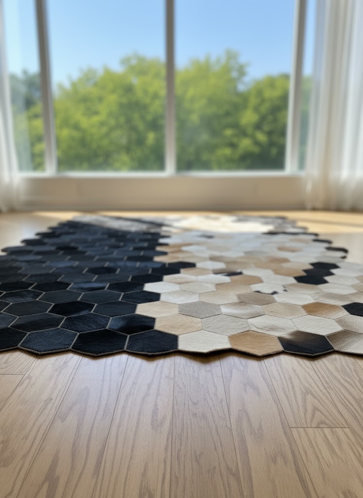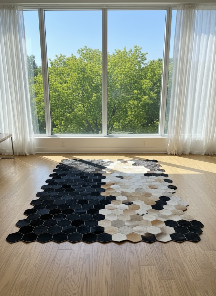 Modern Hexagon Patchwork Cowhide Rug – Black, Beige & Cream