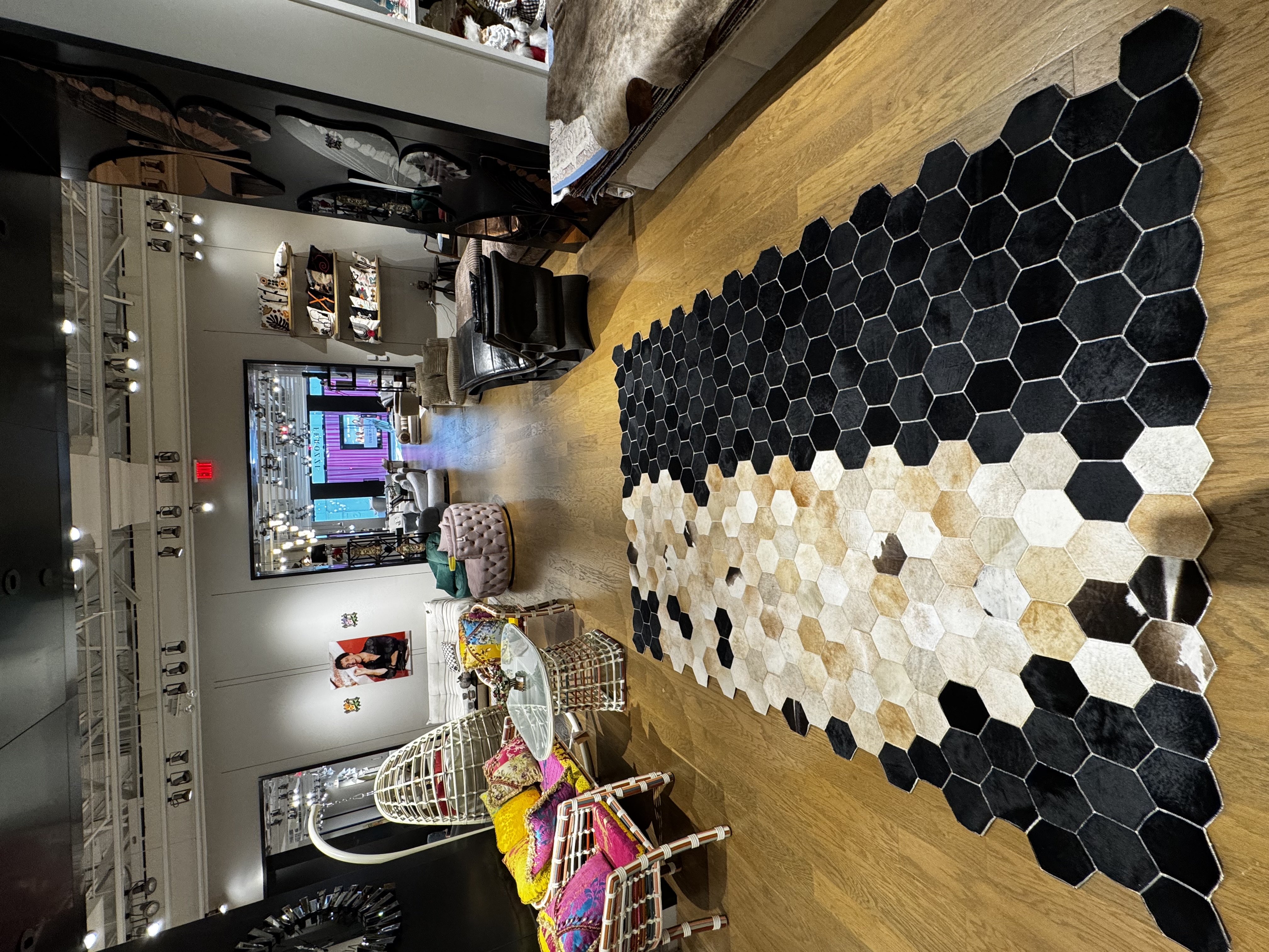 Elevate your home décor with our Modern Hexagon Patchwork Cowhide Rug, designed in a stunning blend of black, beige, and cream tones. Featuring a bold hexagon geometric pattern, this rug delivers a luxurious cowhide look while being crafted from high-quality durable polyester — offering the beauty of cowhide without animal materials.