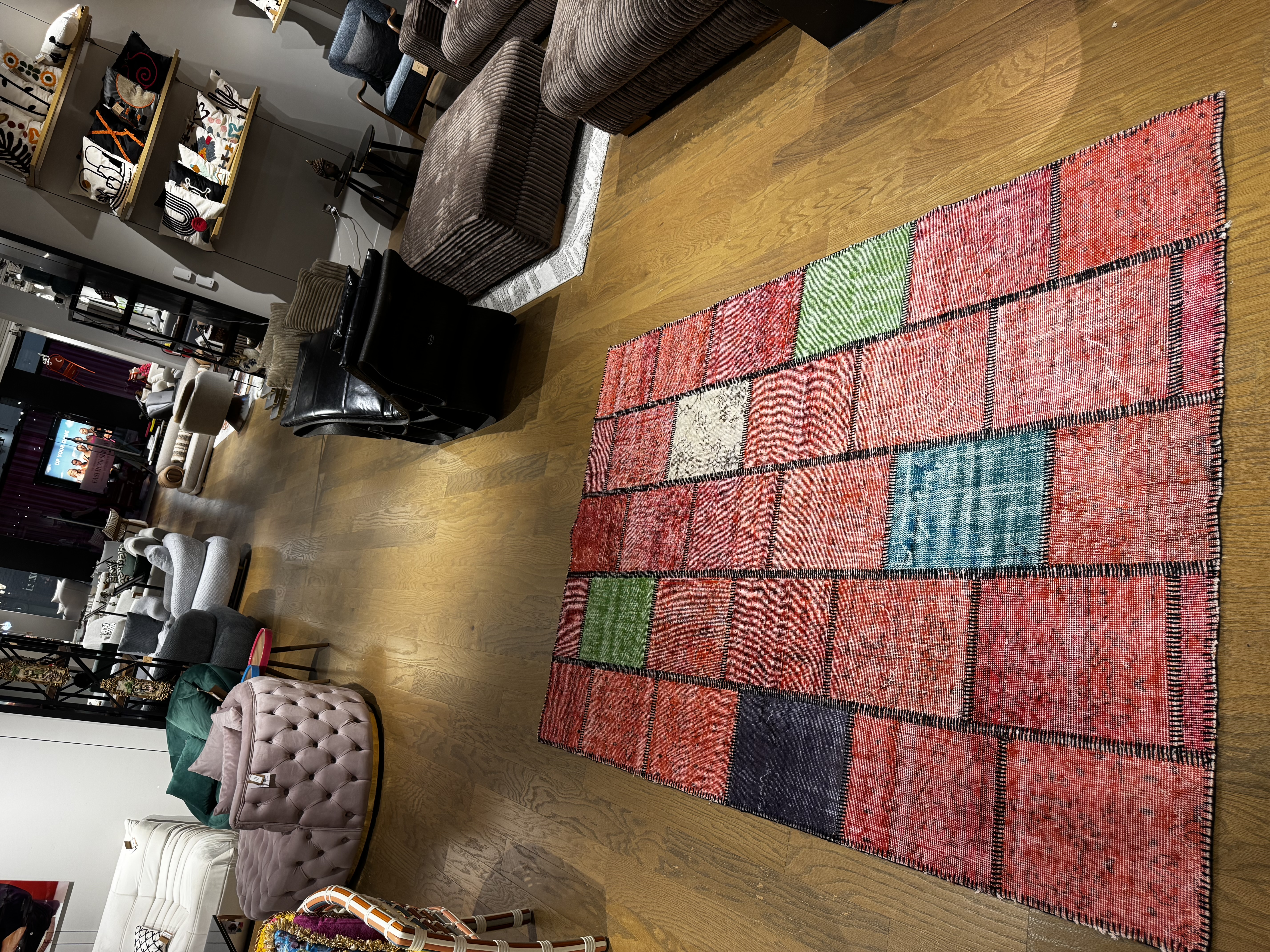 The design celebrates bold colour and pattern: a rich wool foundation adorned with distinct blocks of green, red, yellow, teal and more. The patchwork style offers a playful bohemian vibe while remaining sophisticated and modern.