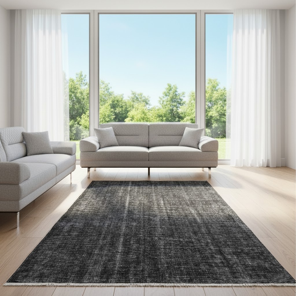 The Obsidian Plain design emphasizes clean lines, coherent tone-on-tone texture, and a refined charcoal grey palette. This minimalist piece functions as a subtle foundation in your room — grounding furnishings without overpowering them.
