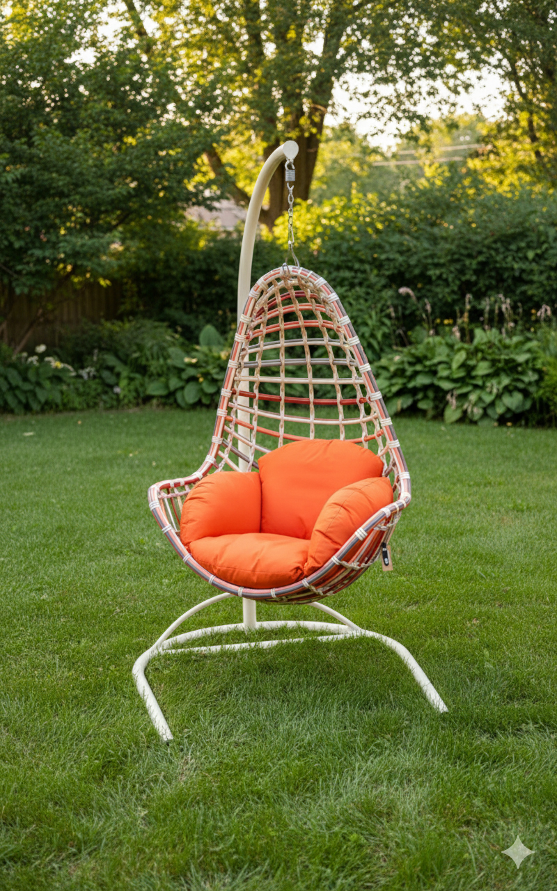 Outdoor Single Rattan Hanging Egg Chair with Stand – Red Frame & Orange Cushion