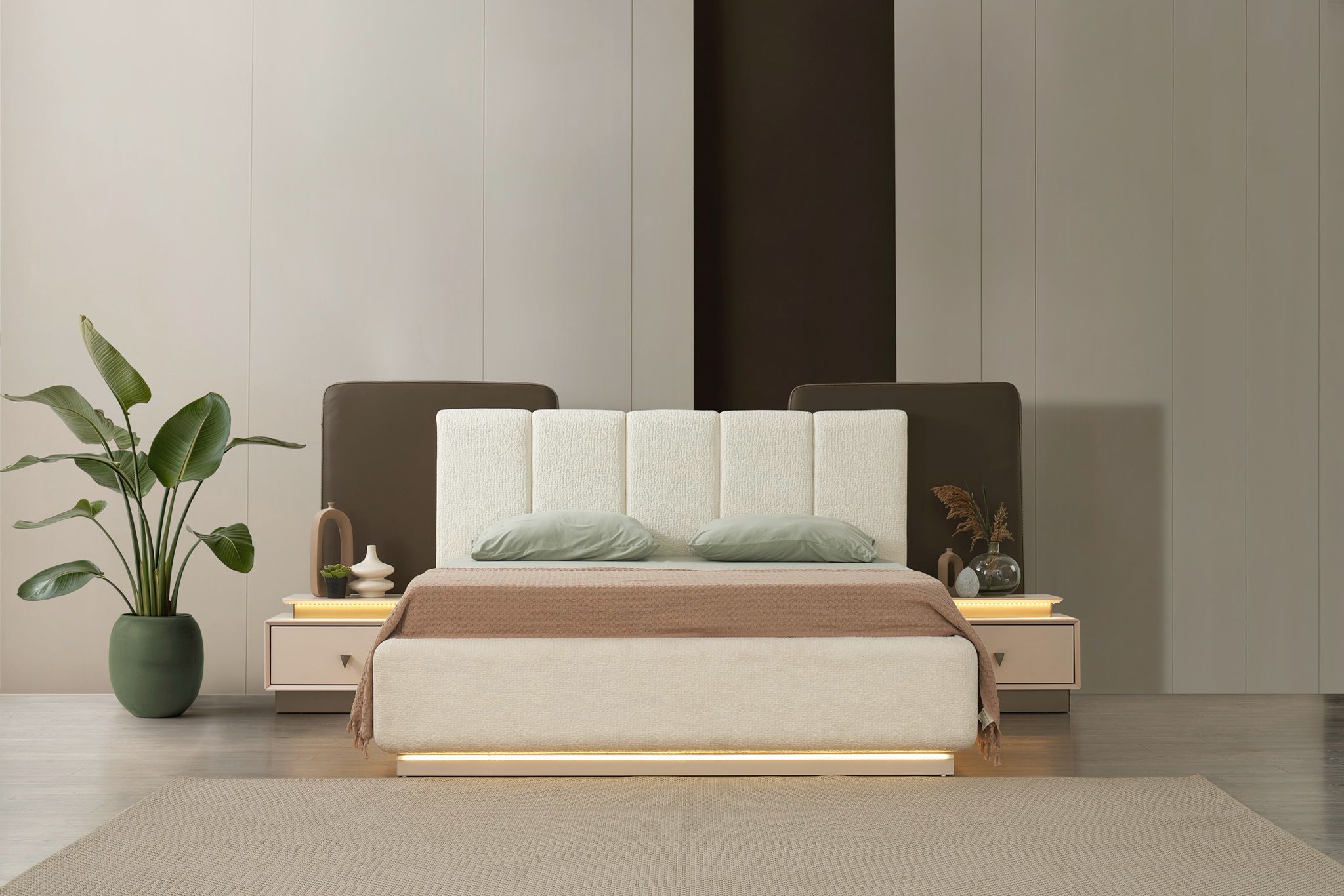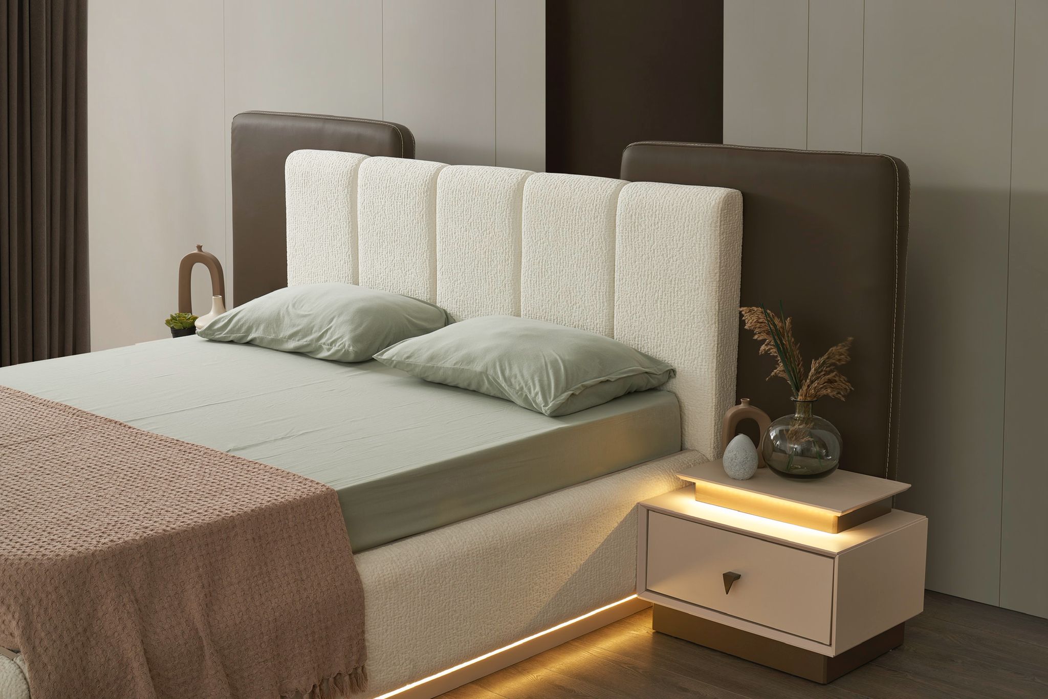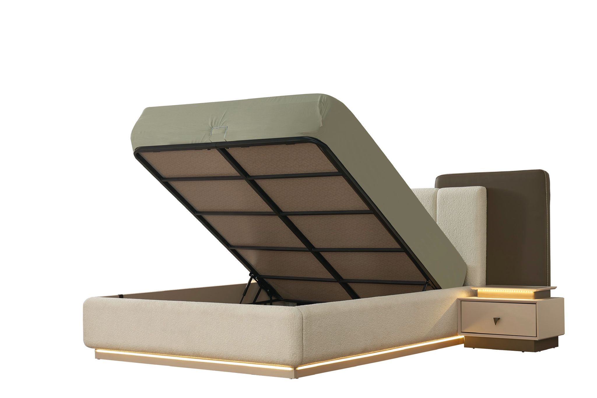Blending function with contemporary style, the Riva bed features a bouclé upholstered headboard, integrated LED under-bed lighting, and matching nightstands with soft-close drawers. Optional hydraulic lift storage maximizes bedroom space, keeping essentials neatly organized. Perfect for modern interiors, this platform bed delivers a hotel-inspired look while maintaining everyday practicality.