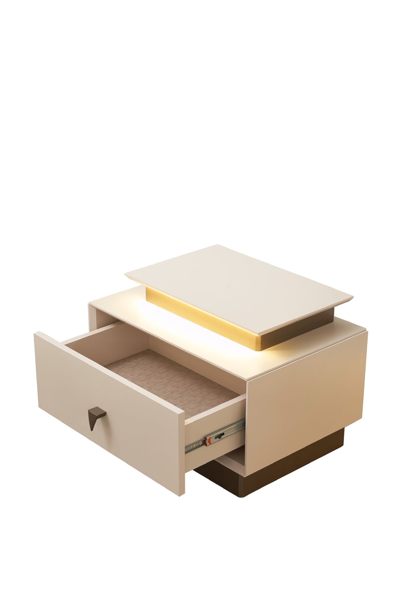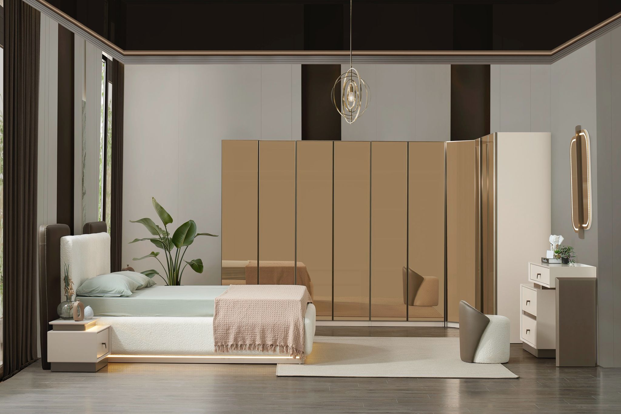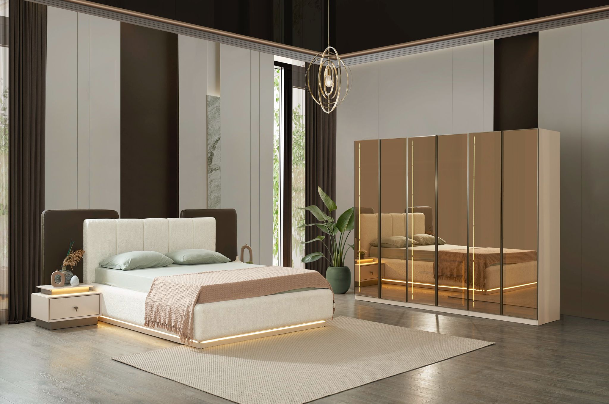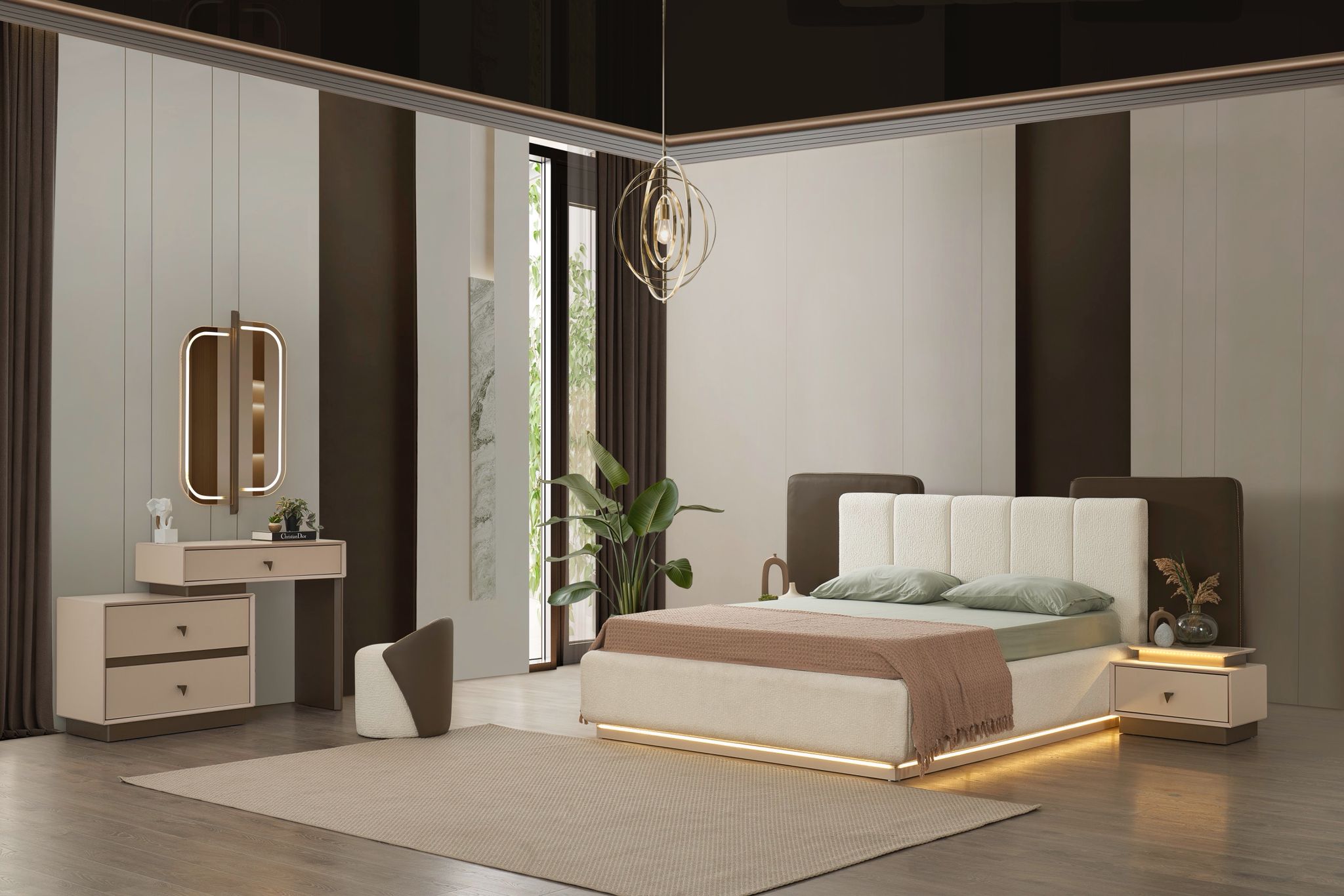 Blending function with contemporary style, the Riva bed features a bouclé upholstered headboard, integrated LED under-bed lighting, and matching nightstands with soft-close drawers. Optional hydraulic lift storage maximizes bedroom space, keeping essentials neatly organized. Perfect for modern interiors, this platform bed delivers a hotel-inspired look while maintaining everyday practicality.