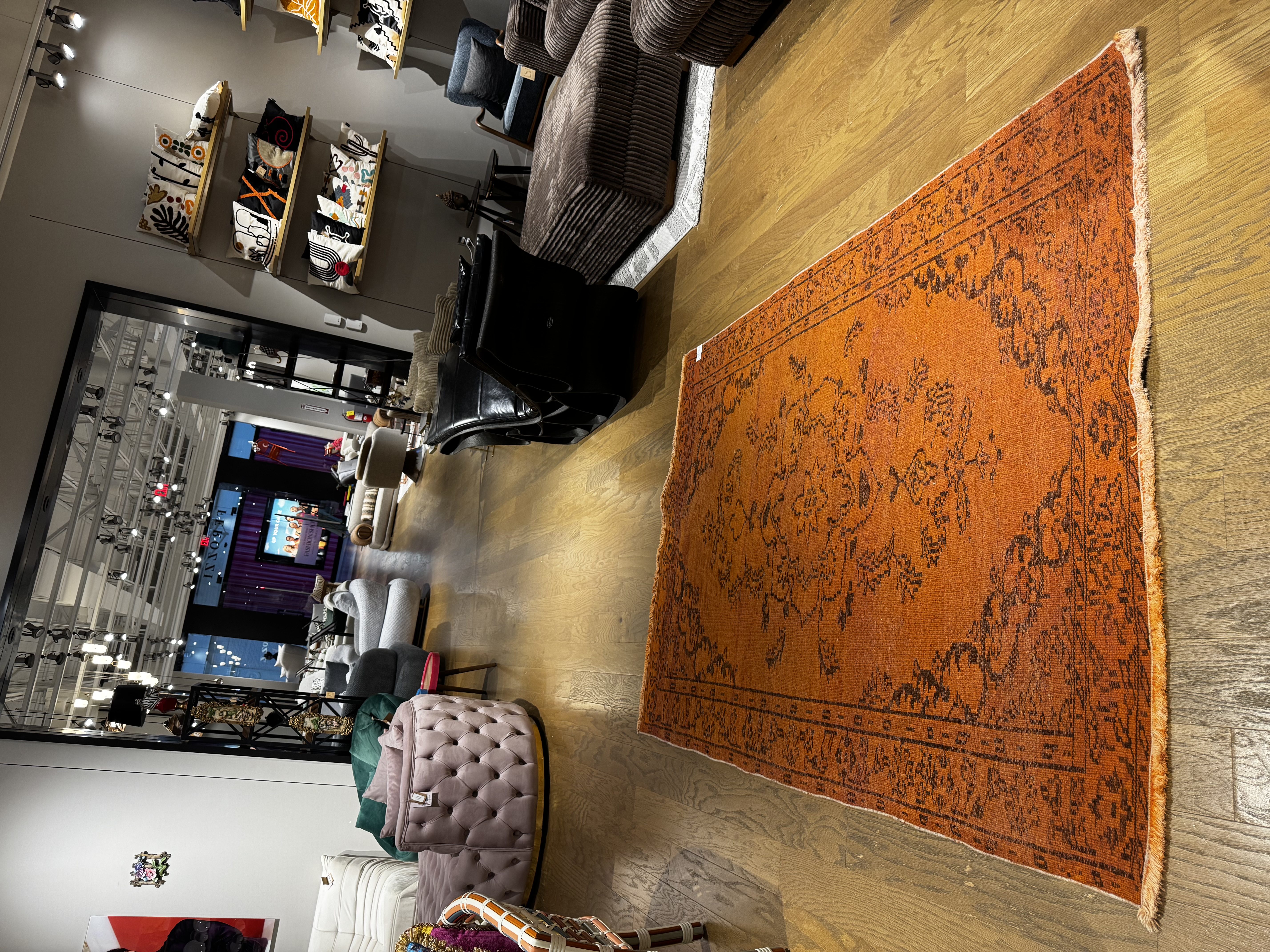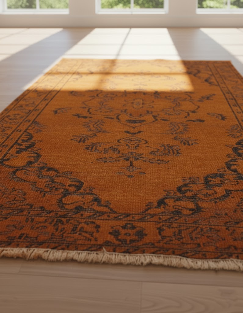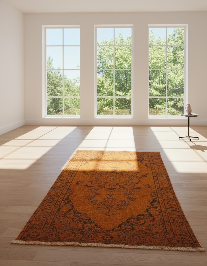handmade burnt orange wool carpet crafted to elevate modern, boho, and vintage-inspired interiors.