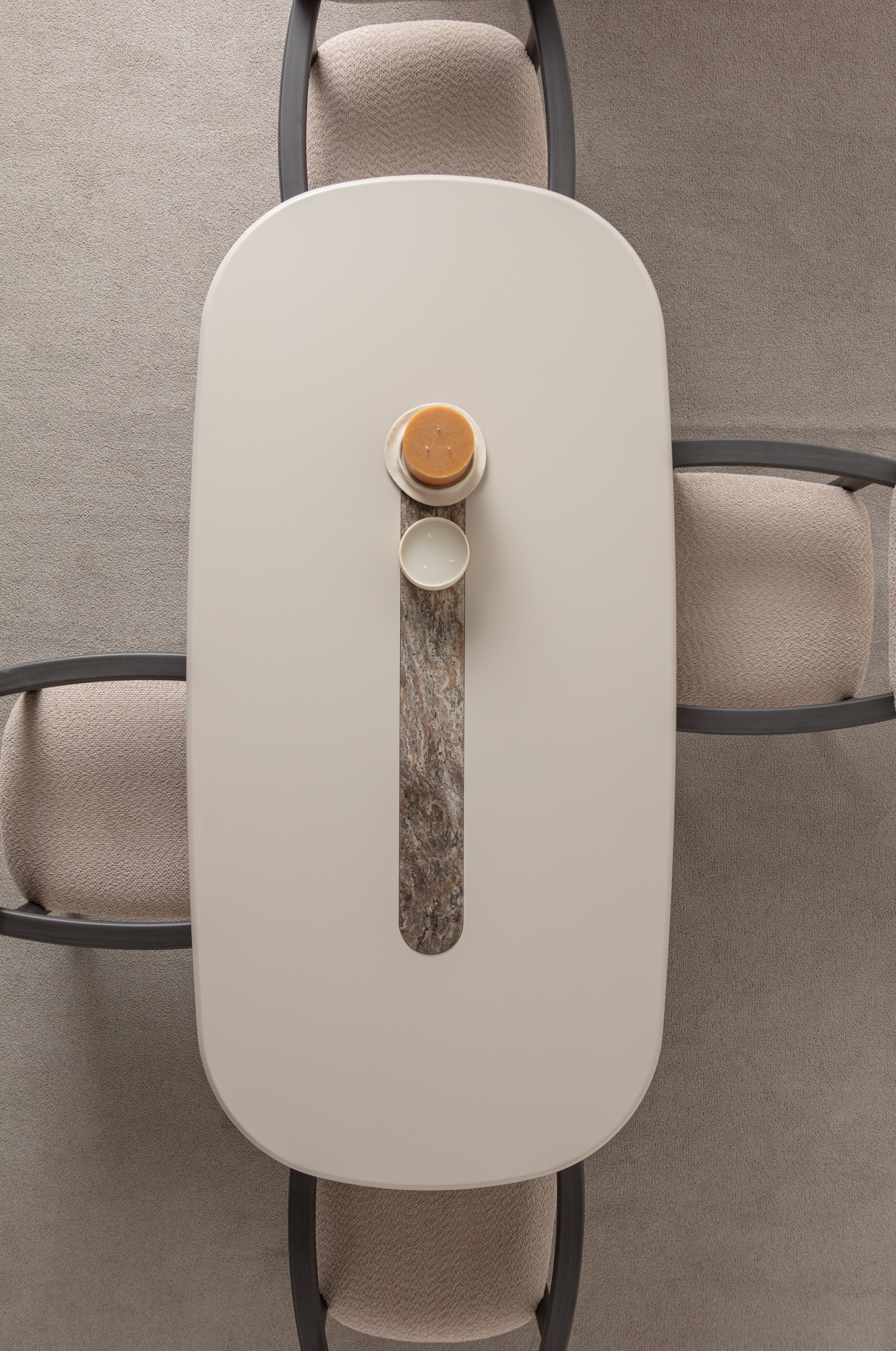 Bring sculptural simplicity to every meal. Vetro pairs a smooth, rounded-edge dining table with matching upholstered chairs for a look that’s warmly modern and made to last. The table is crafted from premium solid wood for long-term stability and finished with an artful marble inlay down the center—an eye-catching detail that elevates everyday dining. Chairs share the same solid-wood frame and are padded with high-quality foam , then upholstered in durable fabric for all-day comfort.